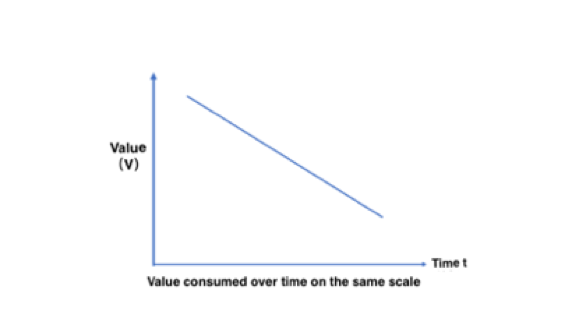 Such consumption is linear, and the rate is proportional to the scale. That is to say, if the number of users is x, then the interest to be paid in the time of ∆t is r1x (r1 is the promised interest rate). Here we did not consider the compound interest and the capital exit. Thus, the value goes down with time.