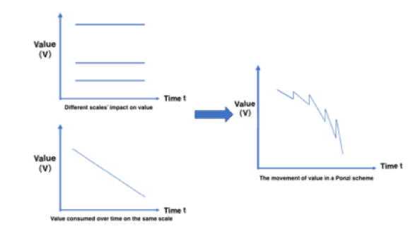 Therefore, the Ponzi scheme must increase its value every time it is scaled up to slow down the consumption of value. However, for the two major factors affecting the value: there is always a ceiling to the "scale", while "time" can last long, such a scheme must end in a collapse.