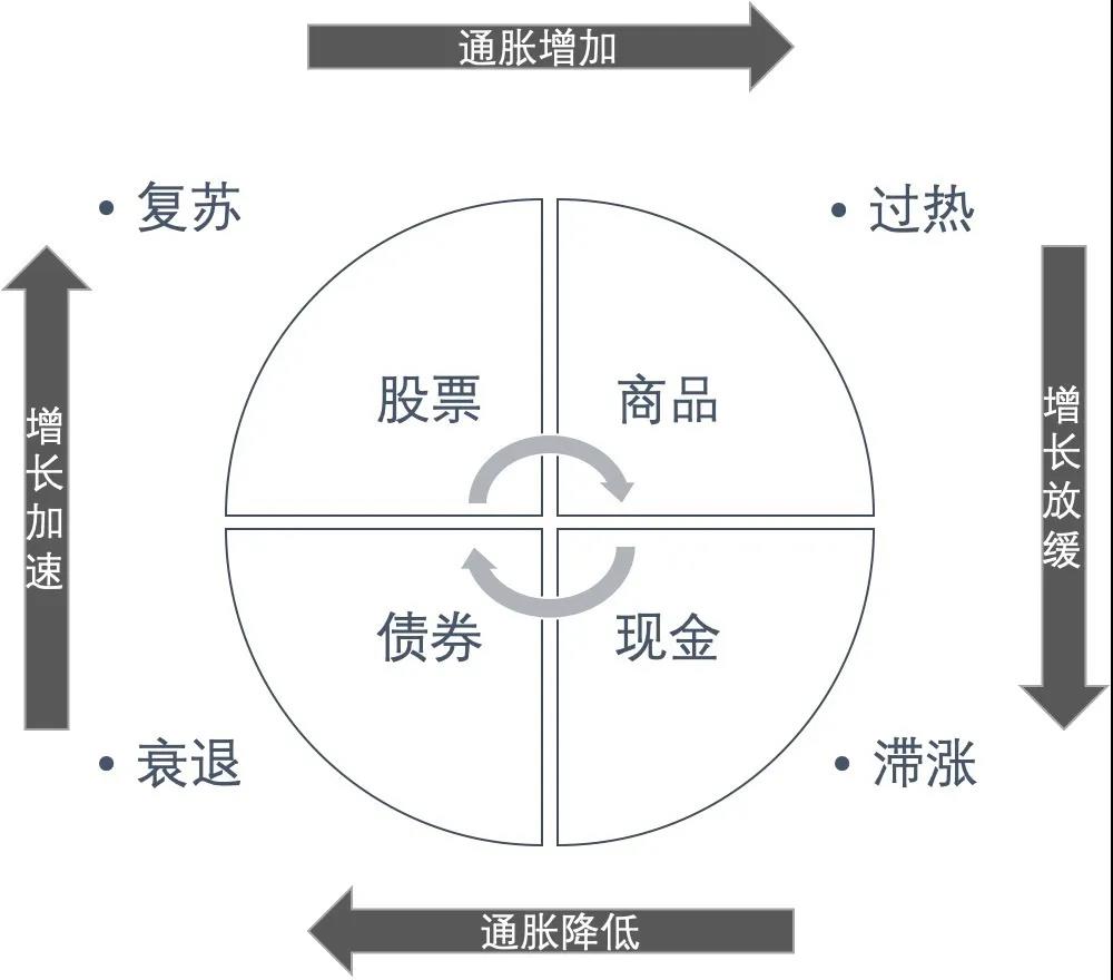 The Merrill Clock uses economic indicators and inflation indicators to divide the economic cycle into: recession, recovery, overheating, and stagflation, corresponding to bonds, stocks, commodities, and cash as the appropriate investments for each phase.